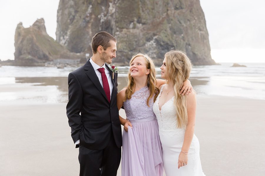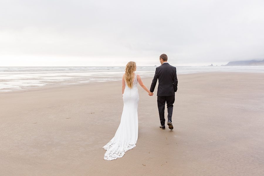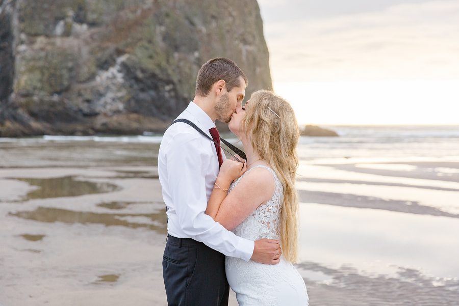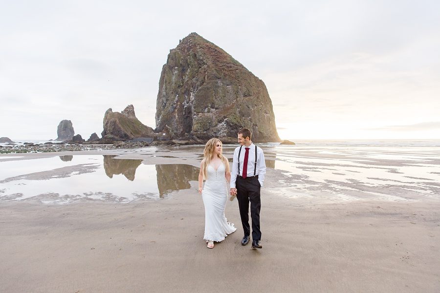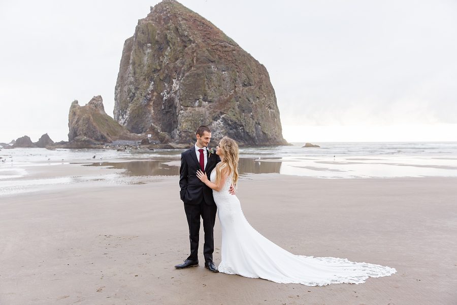 These two had tied the knot earlier in the month in an intimate courthouse ceremony, but wanted some more epic photos in their wedding outfits. So we planned their portrait session for the end of August at Haystack Rock, hoping for great weather.